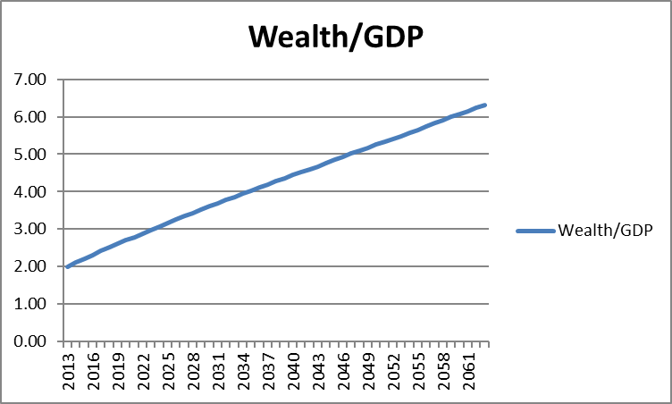 The ratio of Wealth to GDP today is about 2. This ratio increases linearly to increase from 2 to reach a level of 6-6.5, fifty years from now.