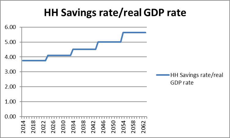 After growing the Wealth, GDP and Savings Rate for a 50-year period, we found that the ratio of the Household Savings Rate to real GDP growth rate starts from 3.75 currently and increases in steps to grow to about 5.5-6, fifty years from now.